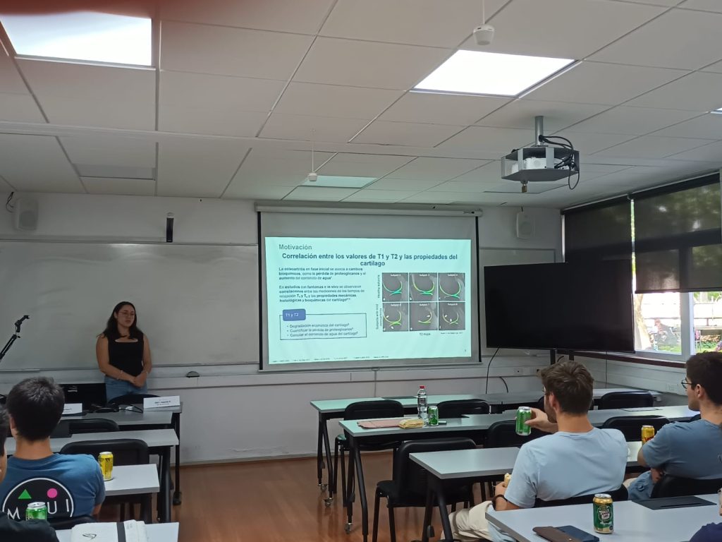 En esta primera sesión Dabne Barrera, alumna de magíster del área Sistemas de Información, profesora supervisora Claudia Prieto, presentó “Highly efficient simultaneous 3D joint T1-T2 mapping of the knee at 0.55T: Comparison of Cartesian and radial strategies”