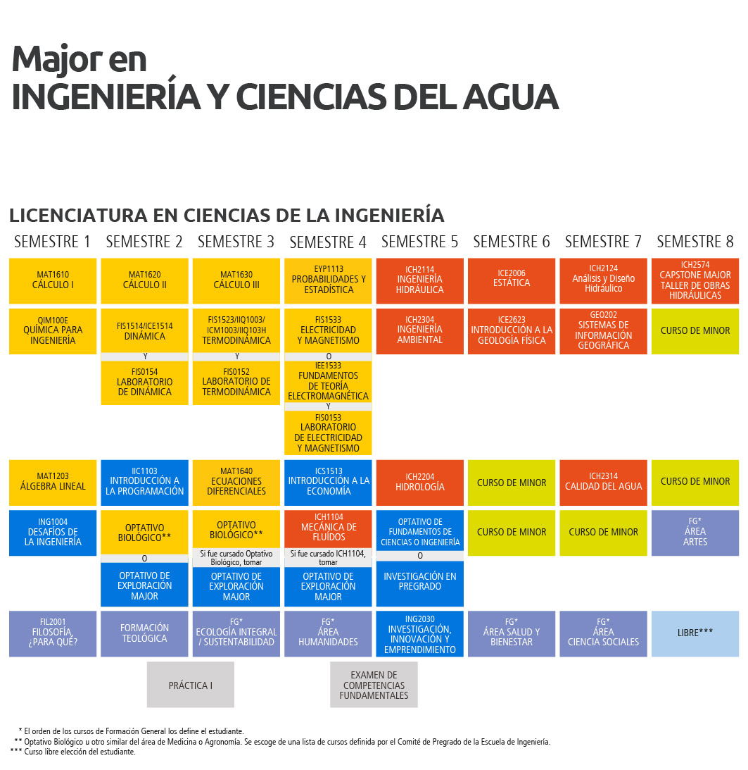 El Major en Ingeniería y Ciencias del Agua está estructurado en torno a tres ejes principales: los fundamentos teóricos de ciencias básicas y de la tierra, el análisis y evaluación de los recursos hídricos y el entendimiento y diseño aplicado a sistemas hidráulicos.