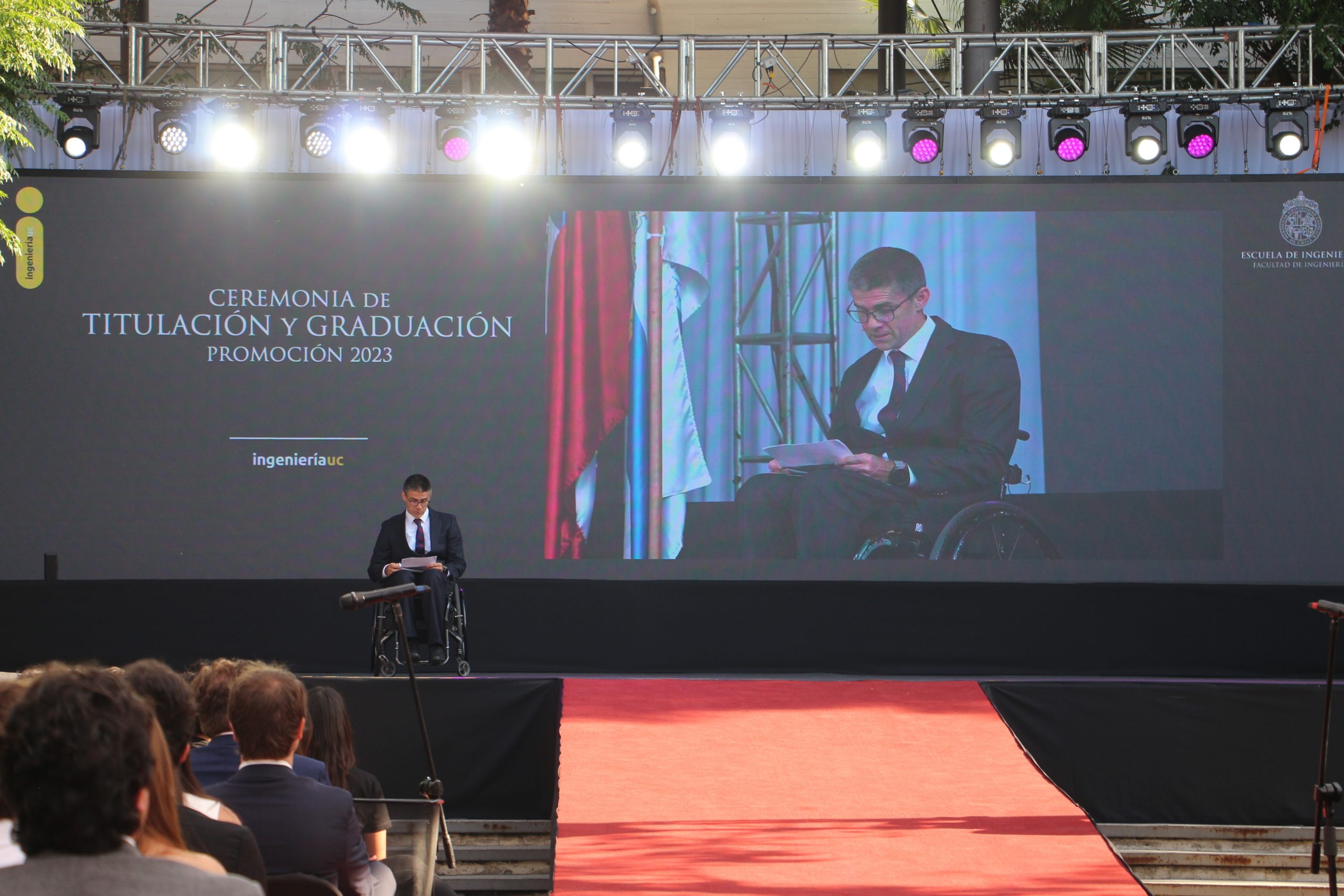 En la ceremonia participó la decana Loreto Valenzuela, autoridades de la Escuela, el cuerpo académicos, y los estudiantes graduados. Además, el invitado de honor fue Sebastián Morales, para ciclista del Team Chile e ingeniero UC, quien dedicó unas palabras.
