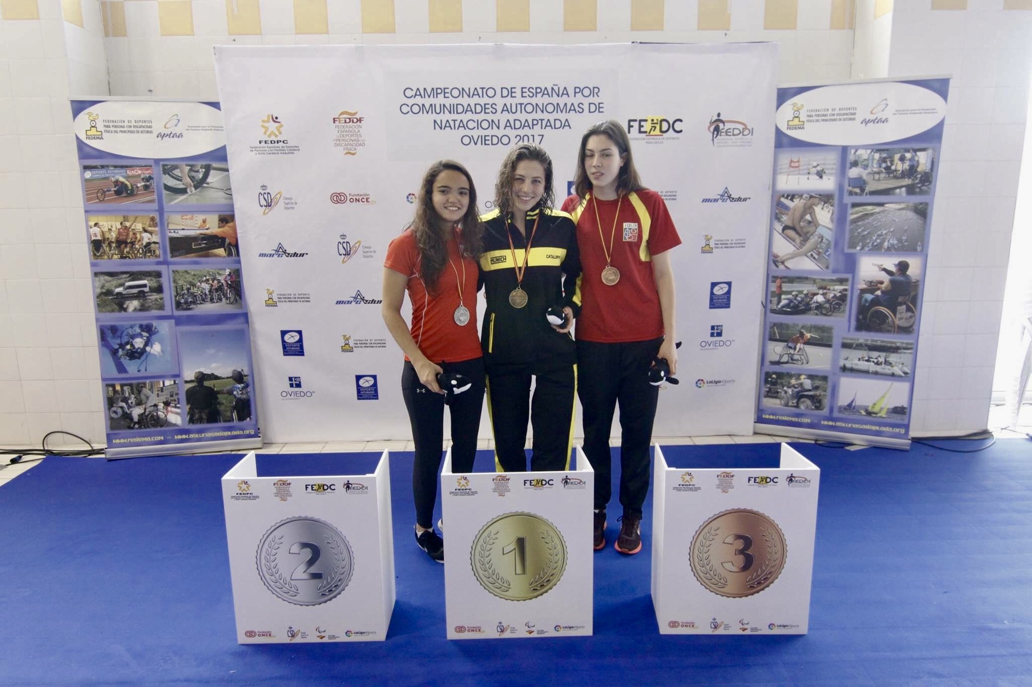 En la foto, Francisca Castro (a la izquierda) en la premiación de la categoría de 100 metros espalda en el Campeonato de España Absoluto en natación adaptada.