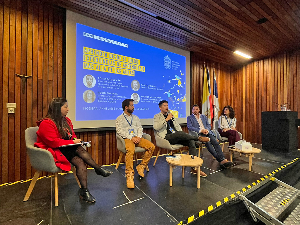 Posteriormente, se realizó el panel “Aprender desde el juego: experiencias de aprendizaje más allá de las aulas” en el cual participaron Eduardo Guzmán, coordinador de rutas formativas del PAR Explora RM Sur Oriente UC, Rocío Fontana Venegas, Profesional del área de compromiso público del Centro de Desarrollo Docente (CDDoc); Pablo Christiny, jefe de formación de Centro para la Revolución Tecnológica en Industrias Creativas (CRTIC); y Rodrigo Villablanca, Gerente de Producto de LEGO® Education en Chile (Arquimed). El espacio fue moderado por Anneliese Marin, jefa de EduLab UC y jefa de transferencia, ciencias sociales y humanidades UC.