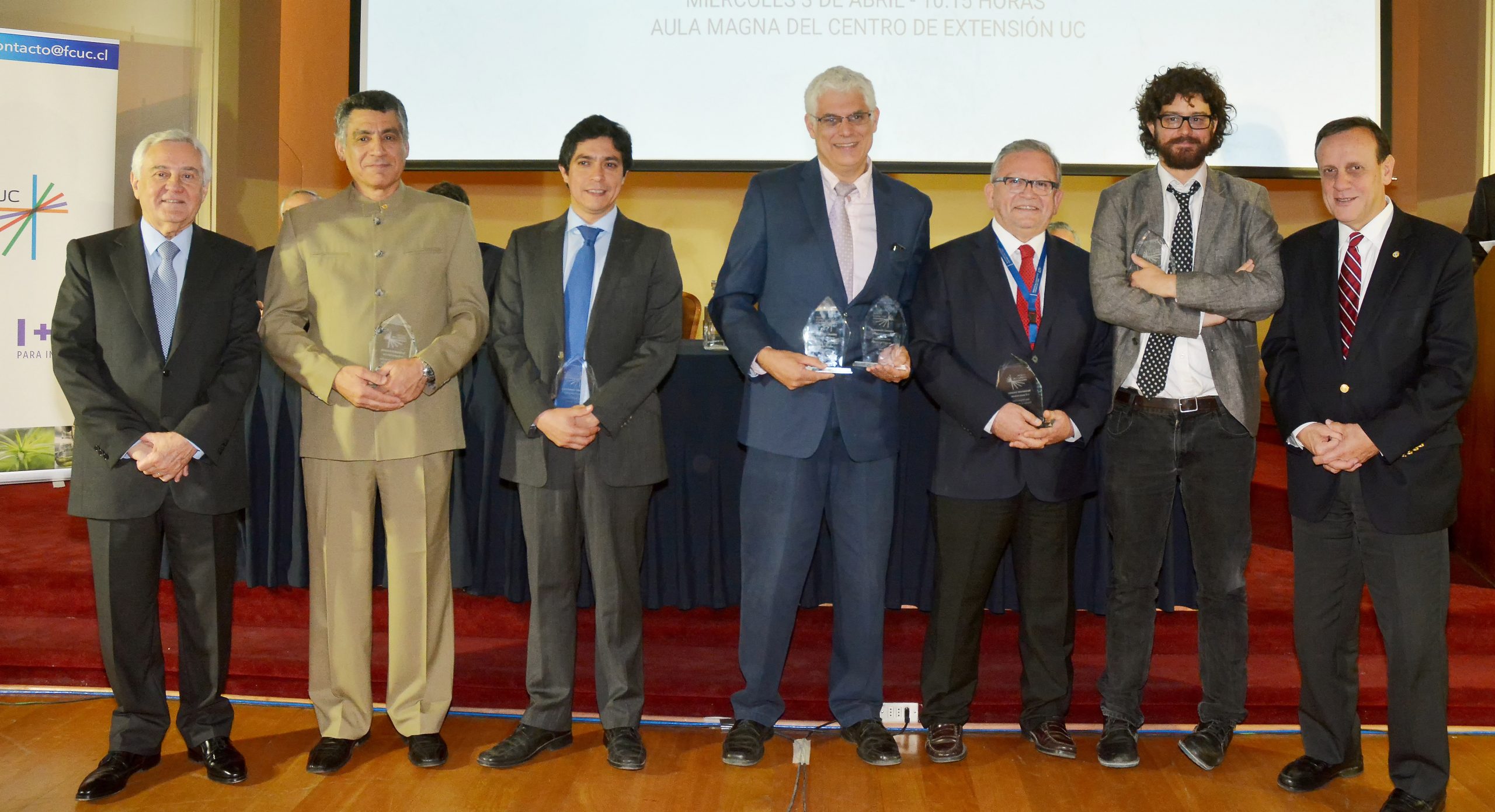 En la ceremonia, se realizó la premiación a los 5 ganadores de los Concursos I+D+i 2018. Correspondiente al Concurso Regular, recibieron sus premios los investigadores de la UC, Alex Vargas y José Tomás Egaña por su proyecto “Injertos biológicamente activos, una nueva alternativa para el tratamiento de defectos óseos”; Sergio Uribe y Antonio Eblen por su proyecto “Dispositivo de espectroscopia de infrarrojo cercano para el registro no-invasivo de la respuesta neuro-vascular”; Jorge Ramos y Giancarlo Troni del proyecto “Advanced Metal Laser Additive Prototyping System”.