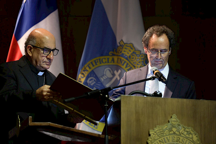 A continuación, y según establecen los Estatutos Generales de la universidad, se realizó el juramento del nuevo rector como parte de una sesión extraordinaria ampliada del Honorable Consejo Superior. El Cardenal Chomali es quien tiene la alta tuición de la universidad y es el vínculo directo e inmediato con la Santa Sede, razón por la cual él presidió la sesión, y tomó el juramento y profesión de fe del rector.